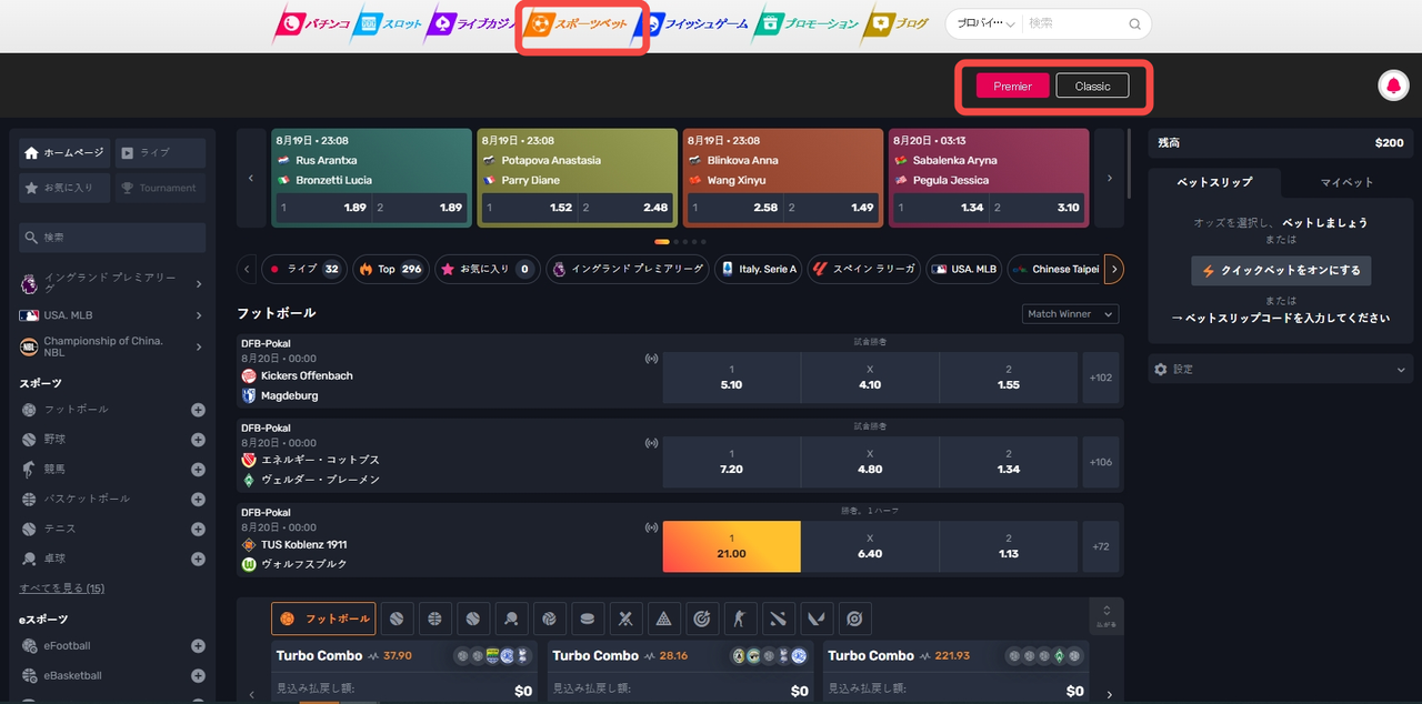 まずは上のメニューから「スポーツベット」を選び、右上の赤枠からPremierかClassicを選択します。(画面はPremierの画面になっています)