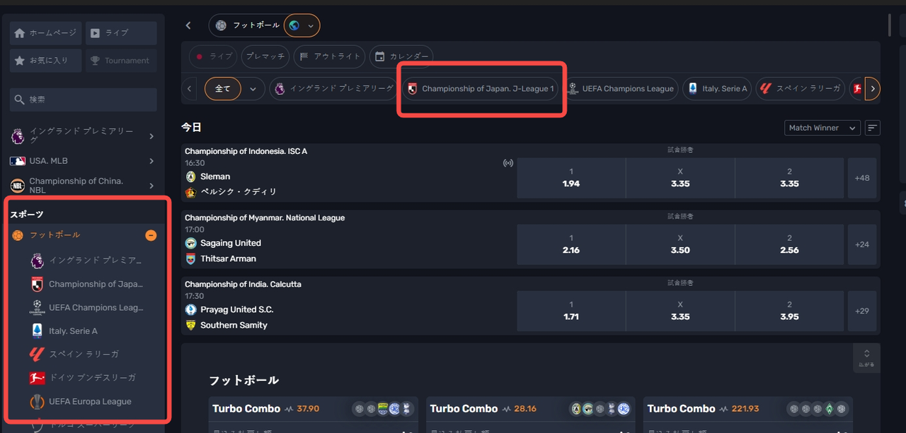 次に、どちらの赤枠でも構いませんのでJリーグをクリックしてJリーグの画面に行きます。