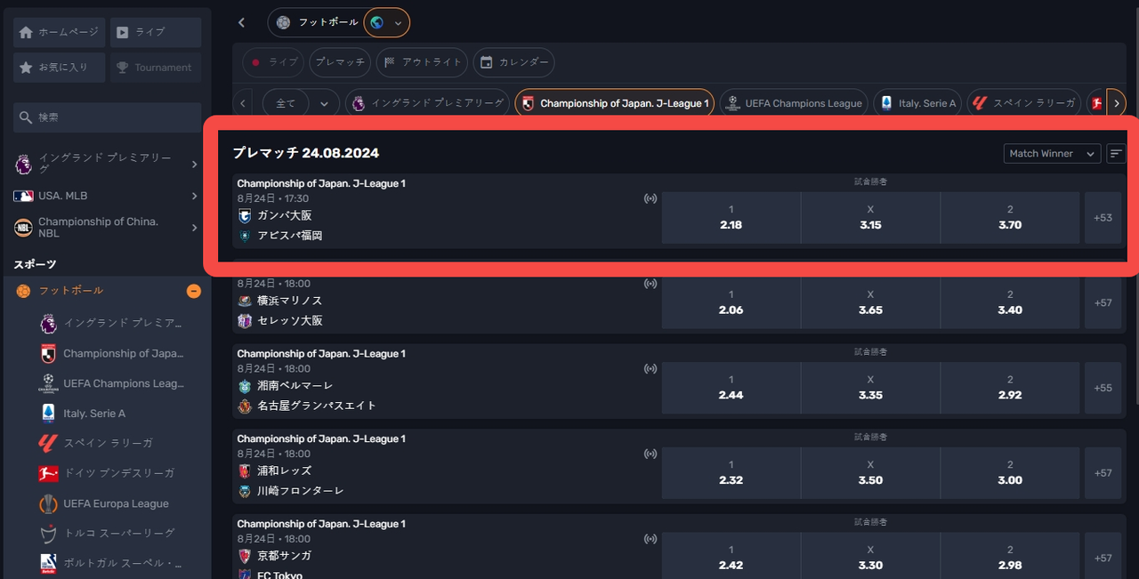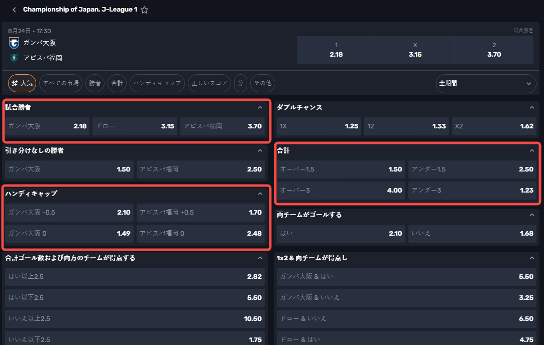 今回は1番上の「ガンバ大阪 vs アビスパ福岡」を選んでみます。クリックするとより詳細なBET画面へ移ります。